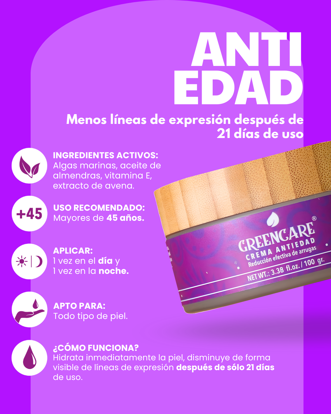 Crema antiedad con algas marinas, aceite de almendras, extracto de avena, vitamina E y más. Hidrata tu piel profundamente Disminuye efectivamente líneas de expresión. Genera colágeno en la piel. Contenido: 50 gr.