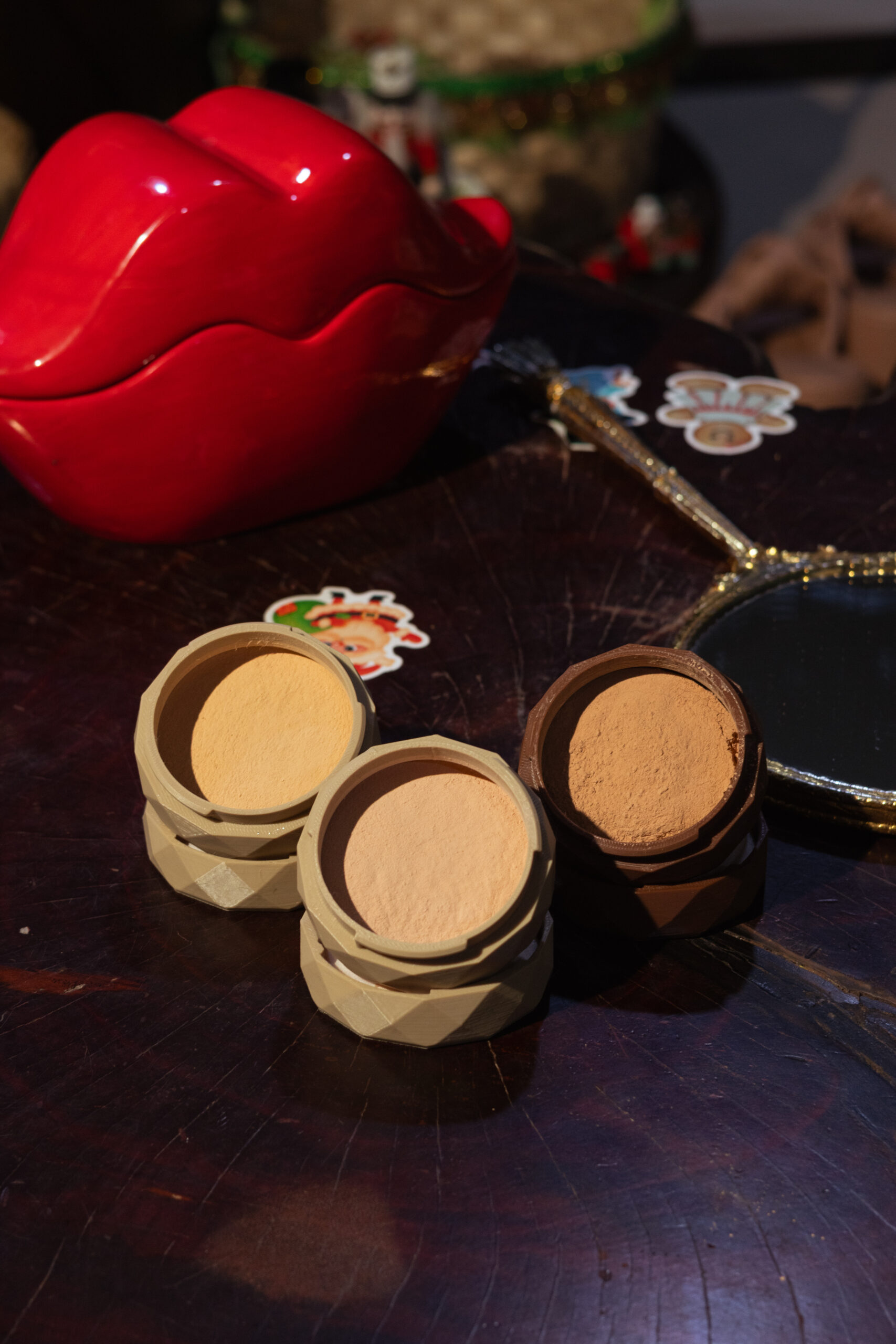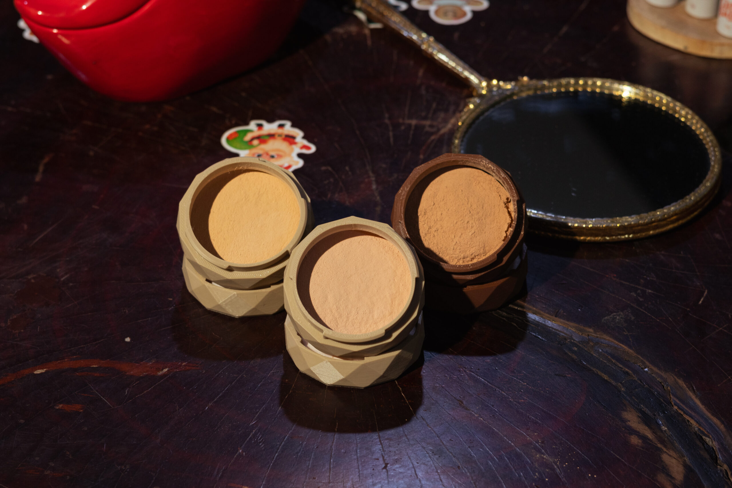 Almidón de arroz, mica sericita, almidón de tapioca, miristrato de magnesio, sílice, óxido de hierro amarillo, óxido de hierro rojo, pigmento azul ultramarino.